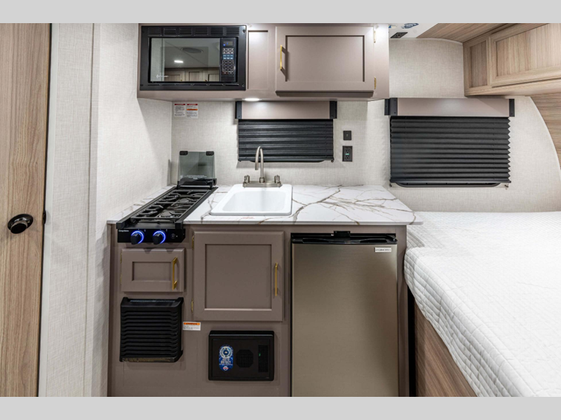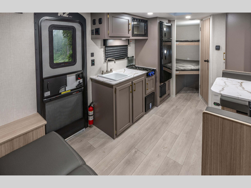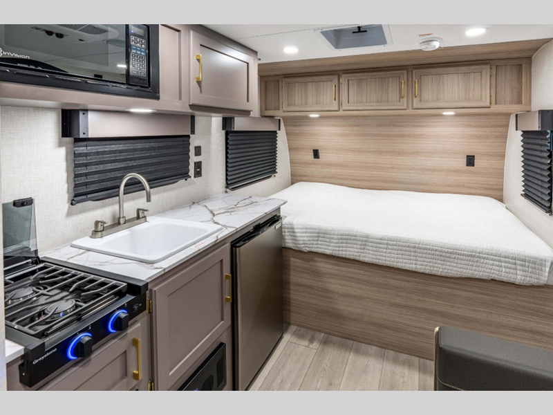 Sleeps 7 Slides 1 Length 22 ft 10 in Ext Width 7 ft 6 in Ext Height 9 ft 4 in Int Height 6 ft 6 in Interior Color Nomad, Mushroom Grey Hitch Weight 530 lbs GVWR 4800 lbs Dry Weight 3810 lbs Cargo Capacity 990 lbs Fresh Water Capacity 20 gals Grey Water Capacity 26 gals Black Water Capacity 26 gals Tire Size 15" Furnace BTU 20000 btu Number Of Bunks 2 Available Beds Queen Refrigerator Type 12V Refrigerator Size 8 cu ft Cooktop Burners 2 Number of Awnings 1 Axle Weight 3280 lbs LP Tank Capacity 20 lbs Water Heater Type Tankless AC BTU 13500 btu Awning Info 15' Power Axle Count 1 Number of LP Tanks 1 Shower Type Neo-Angled Similar Floorplans