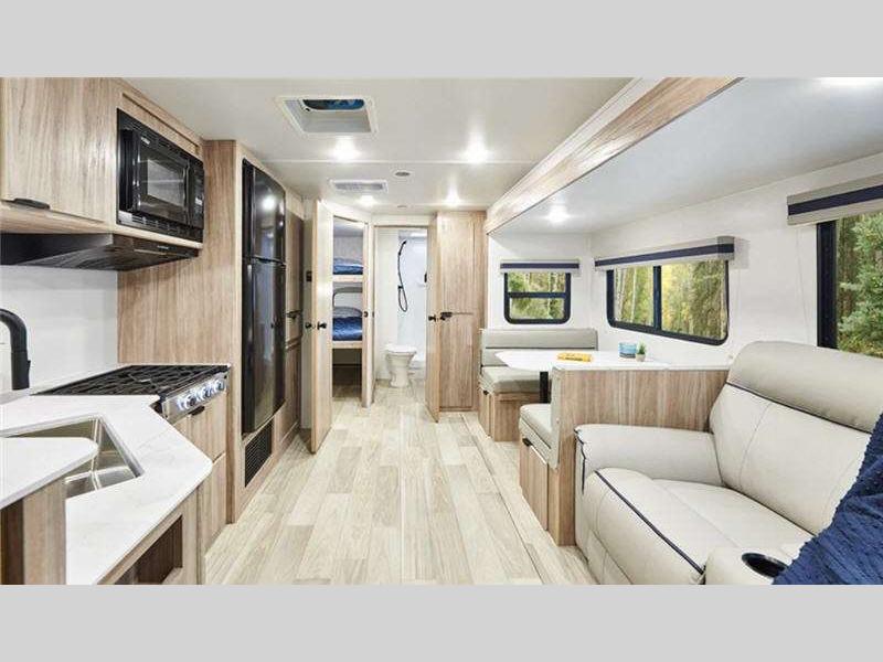 Sleeps 8 Slides 1 Length 29 ft 11 in Ext Width 8 ft Hitch Weight 815 lbs Dry Weight 6454 lbs Number Of Bunks 2 Available Beds Queen Refrigerator Type 12 Volt Refrigerator Size 10 cu ft Cooktop Burners 2 Shower Size 30" x 35" Number of Awnings 1 Water Heater Type Tankless Axle Count 2 Shower Type Standard Electrical Service 30 amp Similar Floorplans