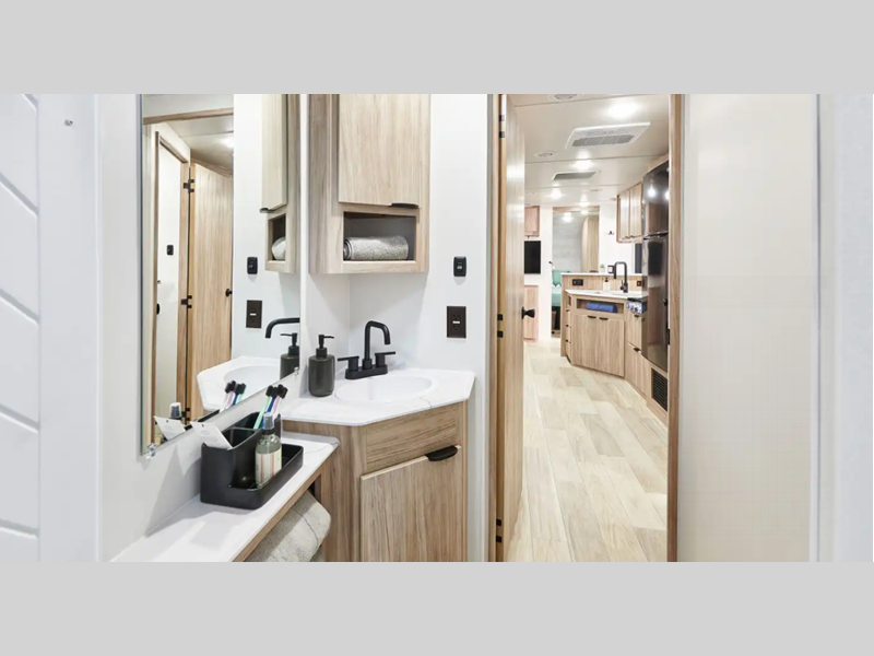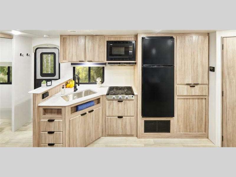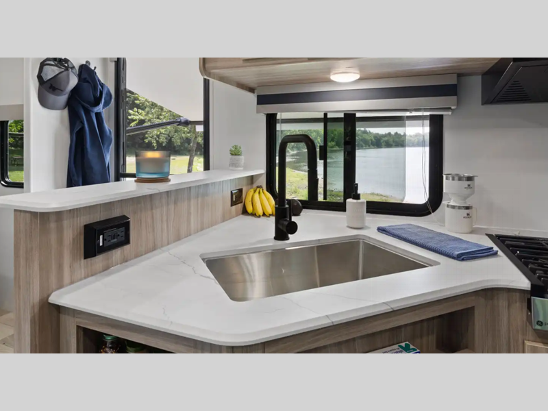 - Well-equipped galley with a large stainless-steel sink, two- and three-burner cooktops, 12-volt refrigerator, and standard convection microwave for easy cooking on the go
