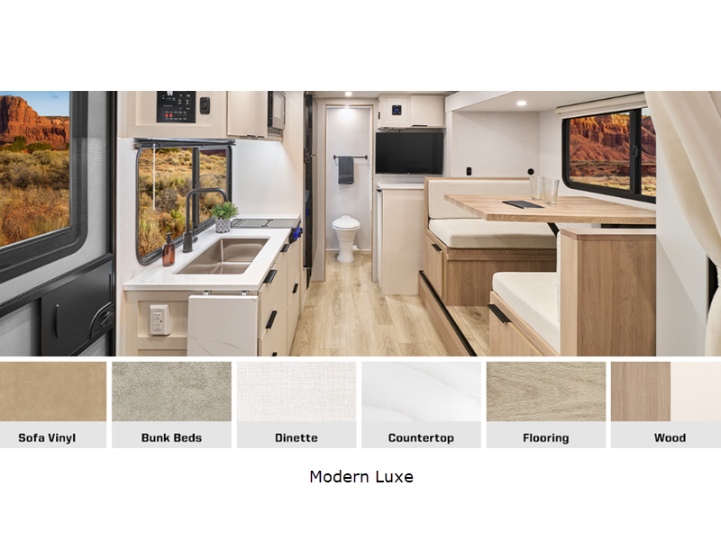 Sleeps 5 Slides 1 Length 21 ft 11 in Ext Width 7 ft Ext Height 10 ft 5 in Int Height 6 ft 4 in Interior Color Modern Luxe Exterior Color White Hitch Weight 448 lbs GVWR 5500 lbs Dry Weight 4049 lbs Fresh Water Capacity 31 gals Grey Water Capacity 25 gals Black Water Capacity 25 gals Tire Size ST235/75R15 Furnace BTU 18000 btu Number Of Bunks 2 Available Beds Full Refrigerator Type 12V Refrigerator Size 10 cu ft Convection Cooking Yes Cooktop Burners 2 Shower Size 30" x 36" Number of Awnings 1 Axle Weight 3000 lbs LP Tank Capacity 20 lbs Water Heater Type Tankless AC BTU 13500 btu TV Info LR Smart TV Awning Info 13' Power with LED Lighting Axle Count 2 Number of LP Tanks 2 Shower Type Standard Electrical Service 30 amp Solar Wattage 200 watts Similar Floorplans